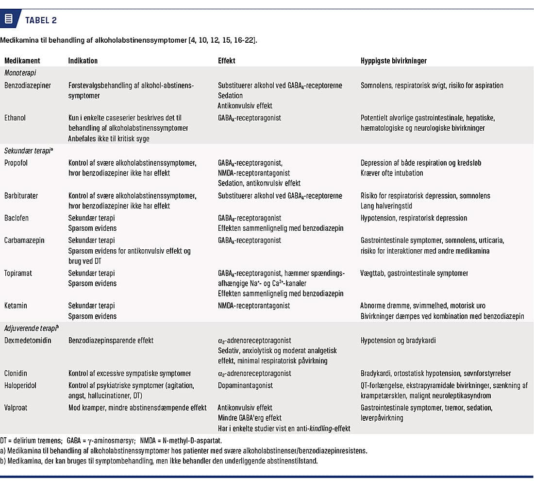 For at finde alternativer til benzodiazepiner er flere såvel GABA‘erge som non-GABA‘erge lægemidler undersøgt til behandling af alkoholabstinenssymptomer (Tabel 2).