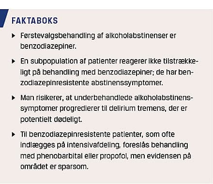 Ny viden om de neuronale og biokemiske processer bag udviklingen af alkoholabstinenstilstande har bragt fokus på fænomenet benzodiazepinresistens. Konsensus om diagnostiske kriterier findes endnu ikke, men man bør få mistanke om tilstanden, når der er behov for eskalerende doser af benzodiazepiner, uden at symp-tomkontrol opnås. Patienter i denne tilstand er i fare for underbehandling af deres abstinenstilstand og har en øget risiko for respirationsdepression, aspiration og død. Behandlingen foregår ofte i samarbejde med intensivafsnit, hvor sekundær terapi i form af enten barbiturater eller propofol kan iværksættes og nøje monitoreres.