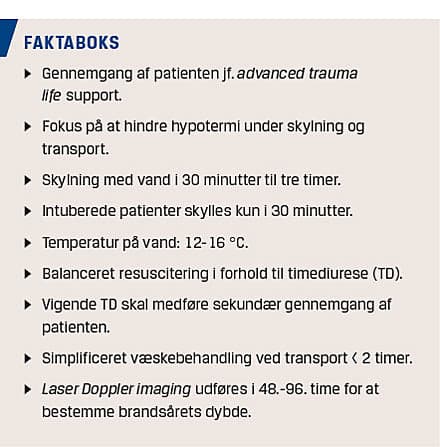 Vejledende bør alle patienter med brandskader, som ikke kan pakkes forsvarligt ind, indlægges uden skelen til brandskadens størrelse. Ved brandskader, der er nær grænserne for væsketerapi, skal patienterne transporteres til Rigshospitalet eller Odense Universitetshospital. Påbegyndelse af væskebehandling kan ske efter simplificerede regler, hvis transporttiden til en specialafdeling er mindre end to timer. Endelig er det vigtigt at være opmærksom på TD, hvis man påbegynder væskebehandling efter Parklands formel, da væskeberegningen kun er vejledende, og væsken bør gives balanceret i forhold til TD for at undgå under- og overhydrering. Til brug i behandling af brandskader er der udarbejdet et flow chart (Figur 2), som kan give et overblik over behandlingen for både personalet på skadestuerne og i almen praksis.