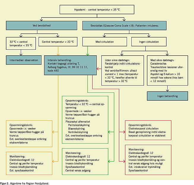 Svær hypotermi: Den livløse patient og patienten med kredsløbskollaps kræver altid hjælp, medmindre vedkommende findes uden for terapeutisk rækkevidde på grund de førnævnte dødstegn. Allerede inden temperaturen kendes, skal der startes genoplivning efter helt de samme principper som hos den varme patient med hjertestop. Der er en teoretisk risiko for, at patienten har en langsom, ikkeerkendt hjerterytme, som forvandles til ventrikelflimren ved hjertemassage, men den risiko må accepteres. Det er vigtigt at måle temperaturen, f.eks. i blæren. Skulle temperaturen være over 32 °C, er det ikke hypotermi, der er skyld i tilstanden. Behandlingen kan da afbrydes efter normale kriterier. Ellers er den bedste chance for redning brug af ECC med samtidig opvarmning af blodet. Dette kan gøres med en mobil HLM beregnet til formålet, hvor der benyttes centrifugalpumpe og et biocoated slangesæt. Dette system minimer behovet for heparin [19]. Under stadigt igangværende hjertemassage kanyleres patientens lyskekar, og når ECC er etableret, standses den basale genoplivning. Det er herefter et job for ECC-teamet at stå for den videre genoplivning. Opvarmningen må ikke foregå på en måde, der udsætter dele af kroppen for høj temperatur. Princippet er især at holde hovedet koldt og hjertet varmt. Se algoritme fra Region Nordjylland (Figur 2 ).