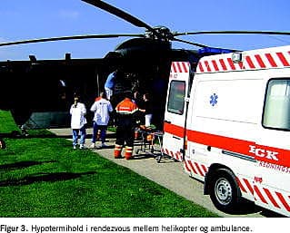 Flyvevåbnet og Århus Universitetshospital i Ålborg har et uformelt samarbejde, hvor flyvevåbnet flyver personel og udstyr ud til behandling af en hypoterm patient, når dette findes indiceret. Flyvevåbnet har altid en redningshelikopter på vagt i Ålborg. Det afhænger af situationen, om der vælges ambulancekørsel eller helikopter, men transport af hypotermiholdet foregår altid i et samarbejde mellem Falck og redningscentret ved Søværnets Operative Kommando (SOK). En hypoterm patient kan behandles på ethvert af de fire traumecentre, men hvis vedkommende behøver hjælp på indlæggelsessygehuset, vil det således primært være fra Ålborg, at der kan stilles et udrykningshold. Det at flytte den hypoterme patient kan være forbundet med betydelig risiko bl.a. for arytmier, og det er endnu sværere, hvis der allerede er hjertestop og foretages hjerte-lunge-redning. Et udrykningshold kan oftest være af sted inden for 20 minutter, efter beslutningen er taget (Figur 3 ). Holdet medbringer en mobil HLM og det udstyr, der normalt skal bruges [19]. Det er en fordel, hvis den hypoterme patient på det lokale sygehus køres til en operationsstue, og hvis holdet kan få hjælp fra operationspersonalet. Ofte foretages opvarmningen på stedet, men hvis der er benyttet ECC, eller det i øvrigt findes indiceret, overflyttes patienten bagefter til en afdeling, der normalt varetager en sådan behandling. Overflytningen af patienten kan foregå i ambulance eller i redningshelikopter med ECC tilsluttet, hvis dette findes indiceret.