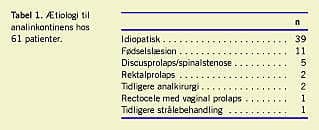 Materiale og metoder: Der blev i perioden 1.5.2003 til 3.12.2005 henvist 61 patienter, 49 kvinder og 12 mænd, med en medianalder på henholdsvis 72 og 67 år til undersøgelse og behandling for fækal inkontinens. Den mediane inkontinensscore på Wexnerskalaen var 11, og den mediane livskvalitetsscore på en visuel analog skala fra 0-10 var fem.