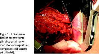Kirurgisk resektion er førstevalg ved GIST, og komplet resektion med frie resektionsrande kan opnås hos mere end 80% af patienterne med lokaliseret sygdom (Figur 1 ). Den patologiske vurdering af resektatet er afgørende for prognosen: jo større tumor og jo flere mitoser desto dårligere prognose. Mindst 50% af alle radikalt opererede GIST-patienter får recidiv, og deres femårsoverlevelse er omkring 50%. Ved recidiv eller primært ikkeresektabel eller dissemineret lidelse bør patienten tilbydes onkologisk behandling med tyrosinkinasehæmmeren imatinib, som virker specifikt på GIST-celle-niveau. Men på trods af denne målrettede medicinske behandling er det ikke alle patienter, som responderer. Nyere data viser, at detaljerede mutationsanalyser kan give vitale oplysninger om baggrunden for eventuelt behandlingssvigt og samtidig guide den videre behandling i retning af nye stoffer og regimener. På nuværende tidspunkt er det uafklaret, om imatinib eller nyere stoffer skal gives som adjuverende eller neoadjuverende behandling for at forhindre recidiv hos patienter med resektabel sygdom [2].