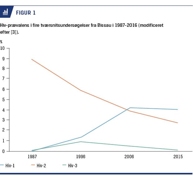 Det er ikke kun stavemåden, der adskiller hiv i GB fra hiv i Danmark, men også typen af hiv. Hiv-2 blev opdaget i 1986, tre år efter det mere kendte og udbredte hiv-1, og findes primært i Vestafrika. BHP gennemførte verdens første befolkningsstudier af hiv-2 i 1987 og fandt en prævalens blandt voksne på 8,9% [4]. På grund af den demografiske opfølgning kunne det påvises, at hiv-2 var forbundet med en tofold overdødelighed, der var beskeden sammenlignet med den op mod 20 gange øgede dødelighed af hiv-1, der var fundet i tilsvarende studier [5]. I en befolkningsundersøgelse i hovedstaden Bissau var hiv-2-prævalensen i 2015 dog faldet til 2,7% mod 4,0% for hiv-1, og 0,1% var dobbeltinficerede med både hiv-1 og hiv-2 [3] (Figur 1). Den tidligere høje hiv-2-prævalens skyldes formentlig, dels at hiv-2 blev spredt hurtigt i forbindelse med prostitution under uafhængighedskrigen 1963-1974, og dels manglende screening for hiv i forbindelse med blodtransfusioner før 1987, men den høje forekomst kan ikke opretholdes ved almindelig seksuel og vertikal transmission [5]. Forståelse af forskellen i immunpatogenese mellem hiv-1 og hiv-2 vil potentielt være til hjælp i forsøget på at finde nye effektive interventioner mod disse infektioner.