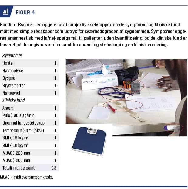 Det populationsbaserede setup med et stort antal patienter med tb indeholder en betydelig mængde kliniske data (Figur 3), og overordentlig god opfølgning har gjort det muligt at udvikle en klinisk score, der er baseret på simple målinger og undersøgelser, Bandim TBscore (Figur 4). Den blev introduceret i 2007 [16] og valideret i de efterfølgende år [17]. Tb-scoren består af subjektive symptomer og kliniske målinger, der kan gennemføres med simple hjælpemidler. Den er brugbar til risikoinddeling af patienter med tb i forhold til dødelighed og kan således prædiktere udkommet [16]. Scoren har også været anvendt til opsporing af nye patienter, der har tb og søger hjælp i primærsektoren for tb-relaterede symptomer [18]. Opsporing af tb er ikke kun afhængig af forbedret diagnostik, men det er også afgørende, hvem der henvises til undersøgelse [19].