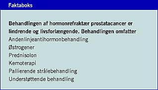 Summary Treatment of hormonal refractory metastatic prostate cancer Ugeskr Læger 2007;169(20):1905-1907 Hormonal refractory metastatic prostate cancer is a fatal disease with a poor prognosis. Treatment options are palliative with second line anti-hormonal, estrogens and prednisolon. When palliation is the goal, the side effects have to be carefully considered. Local radiotherapy has an effective pain relieving effect, and can be repeated. Chemotherapy with docetaxel and prednisolon is indicated in patients with symptomatic metastatic disease. Newer options with immunotherapy and designed molecules have not yet proven effective. Pain and anemia are significant symptoms and should be treated in a multidisciplinary setting.