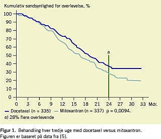 I 1996 blev der publiceret et randomiseret forsøg med prednisolon versus behandling med prednisolon og mitoxantron til patienter med HRPC. Resultaterne af forsøget viste en forlængelse af overlevelsen med tre måneder i den gruppe, der fik kemoterapi, men der var for få patienter i forsøget til, at resultatet var signifikant. Først otte år senere er der kommet resultater af to randomiserede fase III-forsøg med henholdsvis 900 og 1.000 patienter, og i begge studier påvises det, at behandling med docetaxel/prednisolon sammenlignet med mitoxantron/prednisolon respektive docetaxel/estramustin/prednisolon sammenlignet med mitoxantron/prednisolon giver en signifikant forlænget overlevelse på mediant ca. tre måneder [4, 5] (Figur 1 ). Sammenfattende kan man estimere, at kemoterapi giver en levetidsforlængelse på mediant seks måneder sammenlignet med prednisolon alene, hvilket blev bekræftet i data fra et norsk studie af Fosså fremlagt ved Prostate Cancer Symposium 2006. Et vigtigt resultat af forsøgene var signifikant smertelindring og forbedret livskvalitet i docetaxelgrupperne trods bivirkninger.