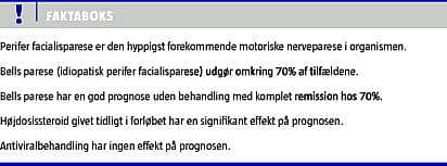 Summary Treatment of idiopathic peripheral facial nerve paralysis (Bell's palsy) Ugeskr Læger 2013;175(5):275-278 Bell's palsy is defined as an idiopathic peripheral facial nerve paralysis of sudden onset. It affects 11-40 persons per 100,000 per annum. Many patients recover without intervention; however, up to 30% have poor recovery of facial muscle control and experience facial disfigurement. The aim of this study was to make an overview of which pharmacological treatments have been used to improve outcomes. The available evidence from randomized controlled trials shows significant benefit from treating Bell's palsy with corticosteroids but shows no benefit from antivirals.