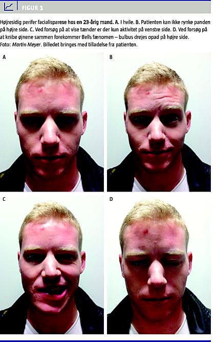 Ved BP er der lammelse af hele den ene ansigtshalvdel (Figur 1 A-D), smerte i øreregionen, smagspåvirkning og for en mindre andel af patienterne også hyperacusis. Ved BP er der i modsætning til ved andre former for perifer facialisparese hverken hørenedsættelse, øreflåd, febrilia, svimmelhed eller andre neurologiske symptomer [1]. En perifer facialisparese, der er forårsaget af infektion med varicella-zoster-virus, kan somme tider fejltolkes som en BP, da der i nogle tilfælde først udvikles udslæt i øregangen flere dage efter debut af paresen. I særlige tilfælde udvikles der slet ikke udslæt: zoster sine herpete [15]. En omhyggelig anamnese og objektiv/paraklinisk undersøgelse med bl.a. otomikroskopi, palpation af glandulae parotis, otoneurologisk undersøgelse og høreprøve med registrering af stapediusrefleks må derfor pointeres at være altafgørende for at stille denne eksklusionsdiagnose og dermed for fastlæggelsen af en behandlingsstrategi. Blodprøvetagning er ikke rutinemæssigt indiceret ved BP. Ved mistanke om infektiøs årsag til perifer facialisparese skal patienten lumbalpunkteres for at udelukke borreliose, herpes simplex-virus og herpes zoster-virus. Den diagnostiske værdi af enkeltstående antistoftitre i den akutte fase er sædvanligvis beskeden. Den hyppigste årsag til perifer facialisparese hos børn er borreliose, hvorfor alle børn skal lumbalpunkteres. Ved dobbeltsidig perifer facialisparese skal man bl.a. være opmærksom på Guillain-Barrés syndrom, myasthenia gravis, borreliose, mononukleose, sarkoidose, dissemineret sklerose og traumer [1, 2].