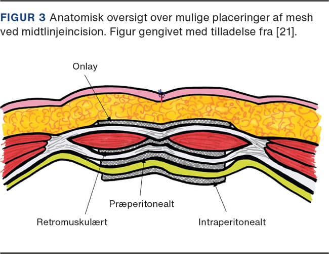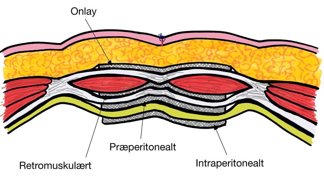 Fasciedefekter på < 4 cm, herunder porthernier, kan opereres med enten åben eller laparoskopisk teknik. Med en åben adgang vælges ofte onlay (dvs. oven på fascien) eller retromuskulær meshplacering (Figur 3) [22], hvis herniet er placeret i midtlinjen [23]. Det anbefales altid at anvende mesh ved incisionalhernier for at nedsætte risikoen for recidiv. Meshen i sig selv øger ikke risikoen for kroniske smerter.