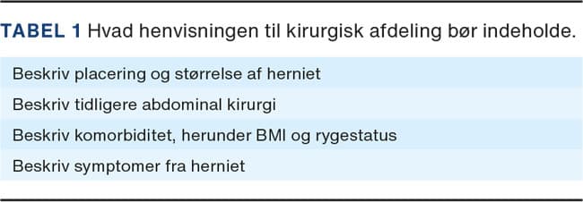 Patienter med et ønske om operation bør henvises til nærmeste kirurgiske afdeling (Tabel 1). Operationsindikationen afhænger af graden af gener sammenholdt med den operative risiko, og denne vurdering er en kirurgisk specialistopgave.