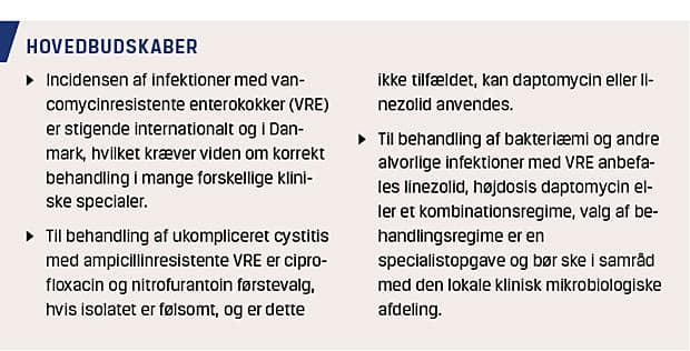 Vancomycin-resistant enterococci (VRE) are a growing healthcare concern, and since 2012 the incidence has increased eightfold in Denmark. Treatment options for infections with ampicillin-resistant VRE are sparse, and there are no Danish guidelines concerning this topic. For treatment of uncomplicated VRE urinary tract infections, ciprofloxacin or nitrofurantoin can be used. The mainstay of treatment of bacteraemia and other severe infections caused by VRE is linezolid or high-dose daptomycin. Combination treatment is recommended for complicated infections and/or prolonged therapy.