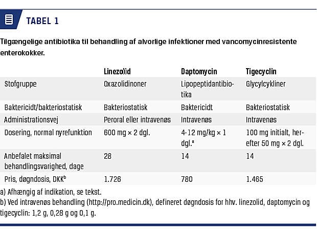 De i Danmark tilgængelige antibiotika til behandling af alvorlige VRE-infektioner er følgende (Tabel 1):