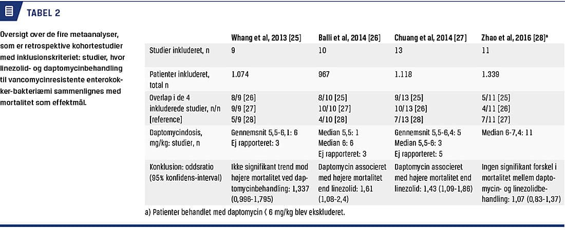 I den nyeste metaanalyse fandt man ingen signifikant forskel [28]. I sidstnævnte er der udelukkende inkluderet studier med daptomycindosis på ≥ 6 mg/kg legemsvægt, og derudover er der inkluderet det hidtil største retrospektive kohortestudie, hvor man fandt en signifikant reduceret mortalitet ved behandling med daptomycin [29].