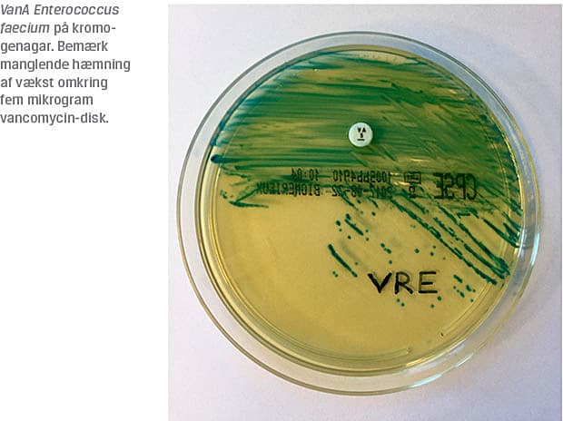 Vancomycinresistente enterokokker (VRE) er et hastigt voksende problem på de danske hospitaler. Antallet af patienter, hos hvem man har fundet VRE i kliniske prøver, er mere end ottedoblet i perioden 2012-2016 [1]. Incidensen steg drastisk i 2013, og stigningen er fortsat siden da [2] til 434 tilfælde i 2016. Infektioner med VRE medfører større mortalitet, længere indlæggelsesvarighed og øget risiko for recidiv end infektioner med vancomycinfølsomme enterokokker. Fund af VRE medfører langvarig isolation, hvilket kan forsinke udredningen og bidrage til de i forvejen øgede økonomiske omkostninger pr. indlæggelse [3]. Enterokokker er naturligt resistente over for mange antibiotikagrupper, de er nedsat følsomme over for penicillin, resistente over for cefalosporiner og lavresistente over for aminoglykosider. Ampicillin er førstevalg til behandling af enterokokinfektioner, hvis isolatet er følsomt for stoffet, men ampicillinresistens er efterhånden meget udbredt.