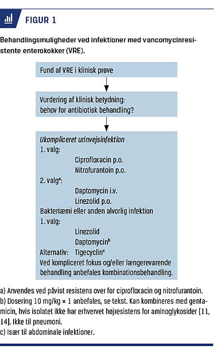 intraabdominale infektioner, knogle- og ledproteseinfektioner samt infektiøs endokarditis. Klinisk praksis i Danmark er at behandle alvorlige VRE-infektioner med både linezolid og daptomycin, men afhængig af fokus og resistensbestemmelse kan forskellige kombinationer komme på tale (Figur 1). Der består stadigvæk et stort behov for afklarende studier mhp. valg af antibiotika til komplicerede infektioner med VRE. Nyere studier [29] tyder på, at daptomycin kunne være at foretrække frem for linezolid. In vitro-forsøg har vist en synergistisk effekt ved kombination af daptomycin med betalaktamantibiotika [21]. Allerede i dag nævnes dette regime ved behandling af VRE-endokarditis [30], men kliniske studier savnes.