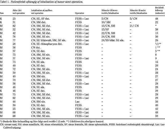 I perioden fra den 1. januar 1990 til den 31. december 1999 blev 28 patienter behandlet for histologisk verificeret invert papillom med FESS på otologisk afdeling, Vejle Sygehus. Der var en overvægt af mænd i materialet, idet der blev behandlet 24 mænd og fire kvinder. Alle tumorerne var lokaliseret lateralt i næsekaviteten, og en patient havde bilateral affektion (Tabel 1 ). Tre patienter udeblev fra kontrol efter henholdsvis en halv, en og fem måneder. Fem patienter fik et enkelt recidiv efter henholdsvis 10, 13, 22, 24 og 24 måneder, mens to patienter havde recidiv to gange. Den ene af disse var en 84-årig mand, der blev behandlet for første recidiv efter 13 måneder og fik andet recidiv efter yderligere 21 måneder; han ønskede ikke yderligere behandling. En 23-årig kvinde blev behandlet for første recidiv efter fem måneder og fik efter yderligere fem måneder et mindre recidiv. Patienten er siden afsluttet efter 48 måneders recidivfri opfølgning. Blandt de 25 patienter, der fulgte afdelingens rekommandation om kontrol, var således syv (28%) med recidiv. Tre kvinder og fire mænd fik diagnosticeret recidiv. Der var således en trend mod større recidivtilbøjelighed hos kvinder. Fishers eksakte test p = 0,0526. Recidivfrit followup var 8-59 måneder (median 29 måneder); en del af patienterne kontrolleres fortsat.