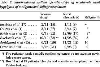 Diskussion: Nærværende undersøgelse indikerer, at resultaterne ved anvendelsen af endoskopisk endonasal operationsteknik er lige så gode som de resultater, der tidligere er opnået ved lateral rhinotomi. For at opnå tilfredstillende resultater er det en forudsætning at tumorens udbredelse præoperativt afklares ved CT. Postoperativt bør patienten følges med relativt tætte kontroller. Især de kvindelige patienter bør følges nøje.