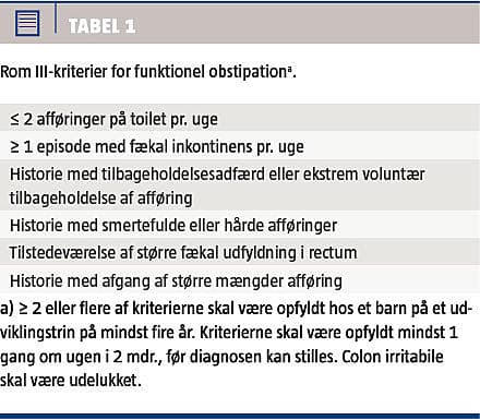 Hos over 90% af børn med kronisk obstipation finder man ikke nogen organisk årsag [4, 5], hvorfor tilstanden klassificeres som funktionel. Både i Danmark og internationalt anvendes de symptombaserede Rom III-kriterier til klassifikation af kronisk funktionel obstipation og andre funktionelle tarmsygdomme [6, 7] (Tabel 1). Den hyppigste årsag til udvikling af obstipation hos børn er withholding (tilbageholdelse af afføring) oftest pga. oplevelsen af smertefuld defækation. Undertrykkelse af tømningsrefleksen fører til yderligere obstipation, som udvikler sig til kronisk obstipation [5]. Komplikationer hertil er analfissurer og fækal inkontinens, som igen er med til at forværre tilstanden. Forlænget tarmpassagetid, abnorm defækationsdynamik, nedsat rektal sensibilitet og øget rektal kapacitet menes at bidrage til udvikling af obstipation. I denne artikel vil vi belyse behandlingen af kronisk funktionel obstipation hos børn med udgangspunkt i det nyligt publicerede Cochranereview [8].
