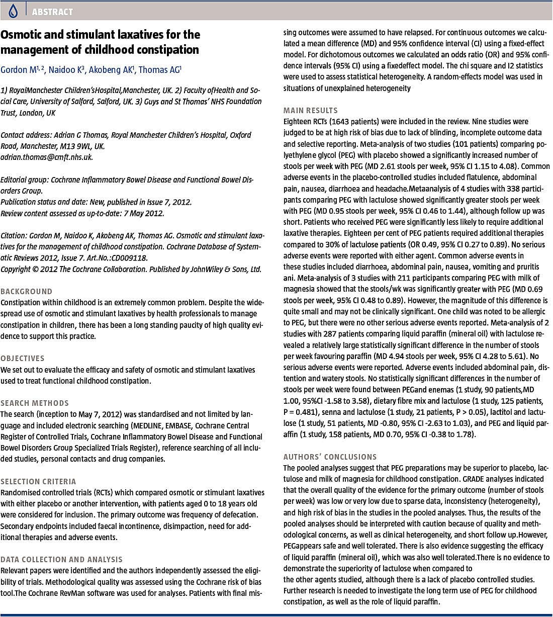 Gordon M, Naidoo K, Akobeng AK et al. Osmotic and stimulant laxatives for the management of childhood constipation. Cochrane Database Syst Rev 2012;7:CD009118.