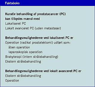 Incidensen af prostatacancer (PC) i Danmark er i voldsom stigning, mens mortalitetsraten har været næsten konstant siden begyndelsen af 1990'erne. Andelen af patienter, som på diagnosetidspunktet har lokaliseret PC, er voksende. Nogle patienter, der har nydiagnosticeret sygdom, vil ubehandlet have så god prognose, at observation (= aktiv monitorering) vil være førstevalg. Overvejelser om patientens forventede restlevetid uden PC sammenholdt med morbiditets- og mortalitetsrisikoen ved den ubehandlede sygdom vil indgå i overvejelserne for og imod kurativ behandling. T-kategori, histologisk differentiering (Gleason score), prostataspecifikt antigen (PSA) og patientens alder er de vigtigste parametre for risiko for progression og sygdomsspecifik mortalitet. Patienter, der har lokaliseret prostatacancer (stadium T1/T2, N0/X, M0/X), kan tilbydes enten operation (radikal prostatektomi med total fjernelse af prostata og vesiculae seminales), brakyterapi (BT) (intern strålebehandling med implanterede radioaktive kilder) eller ekstern strålebehandling (EBRT). Valg af behandling afhænger af prognostiske parametre, patientens alder, komorbiditet og patientens præference.