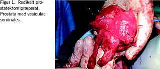 Radikal prostatektomi kan tilbydes mænd, der er i god almentilstand og ikke har væsentlig komorbiditet og en forventet restlevetid (uden cancer) på mindst ti år. Tumoren skal være lokaliseret, men i visse tilfælde tilbydes der også operation ved lokalt avanceret PC med begrænset ekstraprostatisk tumorvækst. Operationen udføres i Danmark overvejende som åben retropubisk præperitoneal operation og i begrænset omfang som laparoskopisk eller laparoskopisk robotassisteret operation (da Vinci-metoden). Generel anæstesi er mest almindelig, men epidural/spinalanalgesi kan anvendes (vågen patient). Den åbne operation udføres igennem en 12-15 cm lang midtlinjeincision fra symfysen og kranialt, alternativt igennem en Pfannenstiel-incision. Prostata og vesiculae seminales fjernes (Figur 1 ), og der udføres sutureret anastomose imellem blære og urethra. Afhængigt af patientens præoperative erektile formåen og den statistiske risiko for ekstraprostatisk vækst kan operationen udføres med bevarelse af nervi erigentes, uni- eller bilateralt. Postoperativt vil patienten, afhængigt af operationsmetode, skulle være kateterbærer i en periode fra få dage til få uger. Indlæggelsestiden er få dage, lidt kortere ved laparoskopisk operation.