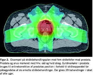 Strålebehandlingen gives med 5-7 strålefelter fra forskellige vinkler rettet mod prostata (Figur 2 ). Med intensitetsmoduleret radioterapi (IMRT), hvor bestrålingen styres med en kompliceret computerbaseret teknik, er det muligt at beskytte rectum mod høj stråledosis [5].