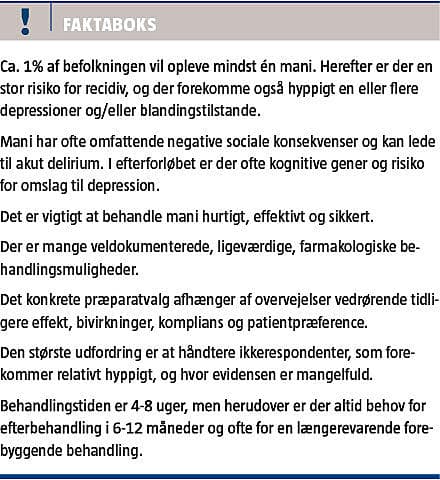 Denne artikel er rettet mod den evidensbaserede manibehandling af personer over 18 år. Kun behandling med psykofarmaka og ECT vil blive dækket, selvom de miljøterapeutiske og psykologiske aspekter af behandlingen er vigtige. Evidensen belyses gennem de nyligt opdaterede vejledende retningslinjer fra World Federation of Societies of Biological Psychiatry (WFSBP) [3]. Den forebyggende behandling af mani vil kun blive kort omtalt. For en oversigt over evidens ved behandling af børn og unge henvises til anden litteratur [4].