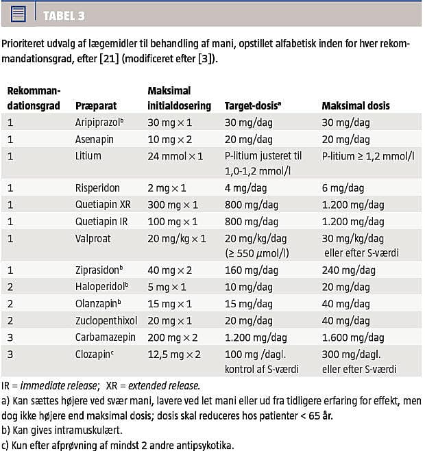 Peroral dosering og RG tilpasset danske forhold fremgår af Tabel 3 [21]. Vi har her opgraderet litium til RG 1, da vi i Danmark har stor erfaring med litium, som dog ikke bør anvendes hos de mest agiterede patienter, da optitrering under serummonitorering kan forsinke effekten. Vi har ligeledes opgraderet quetiapin og asenapin til RG 1 på grund af resultaterne af nyere studier samt givet zuclopenthixol RG 2 trods evidensniveau C, pga. den udbredte anvendelse i Danmark og antagelsen om antimanisk klasseeffekt for alle typiske antipsykotika. Vi tildelte clozapin RG 3 trods evidensniveau C for at tilskynde til anvendelsen i behandlingsrefraktære tilfælde [24]. Vi nedgraderede carbamazepin på grund af interaktionsrisiko.