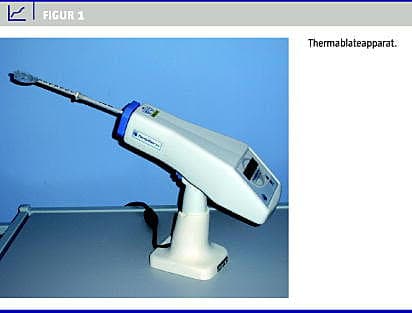 På Slagelse Sygehus har vi siden januar 2006 brugt Thermablate (Figur 1 ), og vi har udført over 150 behandlinger. Vi valgte denne form for behandling, fordi indgrebet kunne udføres ambulant, var let at udføre og havde få komplikationer. Thermablate har en høj arbejdstemperatur (178 °C), hvilket reducerer behandlingstiden til to minutter [3], mens -andre termoballonbehandlingsregimer kræver 8-15 minutters behandling [4-6]. Den højere temperaturgradient forventes at give mindre temperatureffekt dybere end i endometriet, og derfor mindre ubehag for patienterne efter behandlingen. Behandlingstiltaget gjorde det muligt at udnytte vores sparsomme operationskapacitet til andre patientkategorier.
