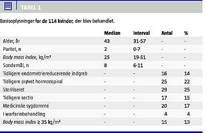 Resultater: Der var få problemer forbundet med indgrebet. Den generelle tilfredshed hos patienterne var god, idet 76% var tilfredse eller meget tilfredse. Hos over 80% reduceredes blødningsmængden, men kun 7% blev amenoroiske.