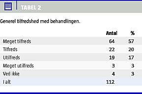 Den generelle tilfredshed var god, idet 77% var tilfredse eller meget tilfredse med behandlingen, se Tabel 2 .