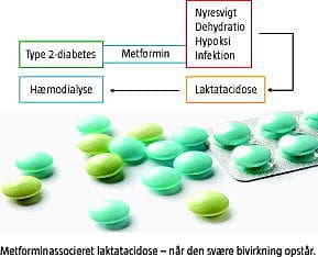 Metformin anvendes i behandling af type 2-diabetes mellitus (T2DM). Fraset hyppige, men oftest tolerable gastrointestinale gener, har metformin få bivirkninger. Metforminassocieret laktatacidose (MALA) er en sjælden, alvorlig bivirkning [1, 2]. MALA er associeret med en mortalitet på 50% [1, 2], men har en bedre prognose end andre tilfælde af laktatacidose [3]. MALA menes at være en følge af laktatakkumulation (øget produktion/nedsat elimination) og kan opstå ved både akutte og kroniske tilstande, der medfører vævshypoksi, f.eks. akut myokardieinfarkt, respirations-, nyre- eller leverinsufficiens og svær infektion/sepsis [4, 5].