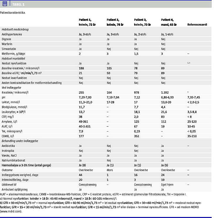 Alle patienterne havde gastrointestinale gener samt påvirket sensorium, respiration og cirkulation, nedsat vævsperfusion og organsvigt. To patienter var septiske. Alle havde udtalt laktatacidose, men trods pH-værdier ned til 6,86 og laktatkoncentration op til 21 mM opnåede tre patienter fuld remission. Alle blev behandlet med væske givet intravenøst, herunder natriumbikarbonat, og HD (Tabel 1 ).