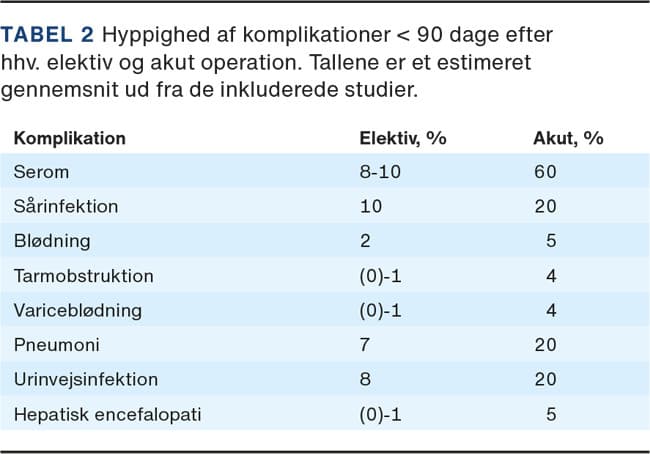 I to prospektive studier med hhv. 30 og 70 patienter med cirrose blev alle patienter opereret elektivt, og den generelle forekomst af postoperative komplikationer var hhv. 6,5% og 8,5%. I det første studie blev der kun rapporteret om medicinske komplikationer (hepatisk encefalopati og pneumoni), mens der i det andet studie kun blev rapporteret om sårrelaterede komplikationer [12, 13].