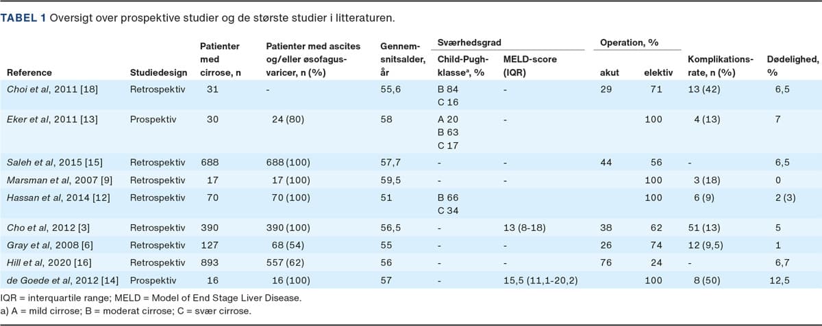 I et amerikansk registerstudie sammenlignede man mortaliteten blandt 899 patienter med cirrose med mortaliteten blandt 31.627 patienter uden cirrose [16]. Ud af de 899 patienter med cirrose havde 342 (38%) kompenseret cirrose, og 557 (62%) havde dekompenseret cirrose, mens 678 (75%) patienter med cirrose blev opereret akut. Blandt patienter, som havde cirrose og fik foretaget akut operation, døde 54 af 678 (8%) mod seks af 215 (2,5%) af de elektive operationer (p < 0,001). Mortalitetsrisikoen var signifikant højere blandt patienter med cirrose end blandt patienter uden cirrose (OR = 2,8; KI = 2,1-3,8).