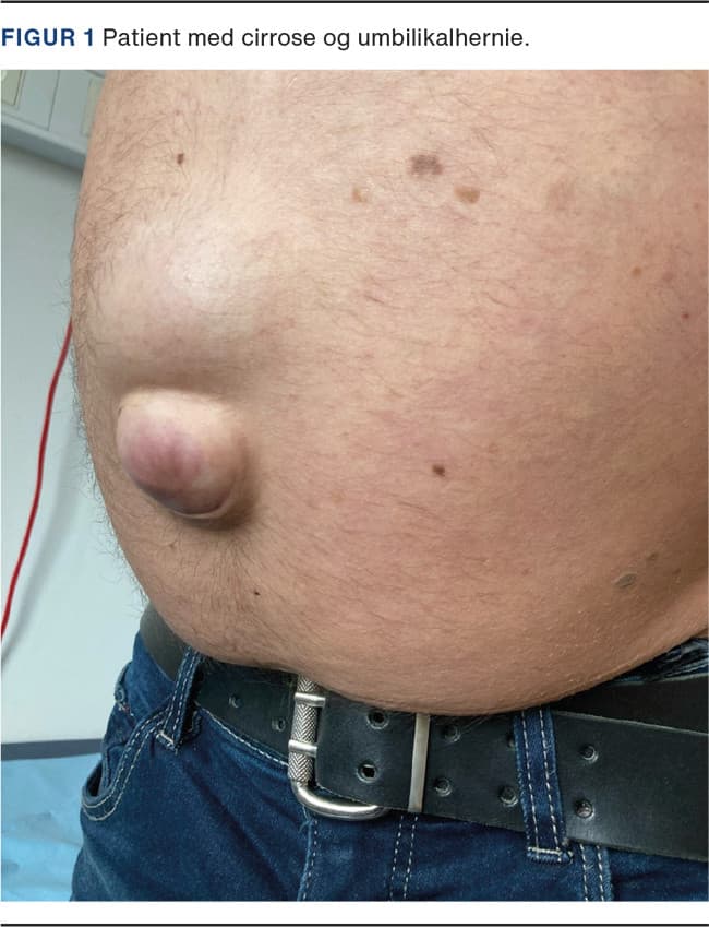 Navlebrok er en udposning af intraperitonealt indhold gennem en bugvægsdefekt i relation til navlen og kan indeholde oment, præperitonealt fedtvæv, væske og tarm. Incidensen af navlebrok i Danmark hos baggrundsbefolkningen er estimeret til at være ca. 2% [1]. Gravide, patienter med cirrose og overvægtige personer har højere risiko for udvikling af navlebrok end baggrundsbefolkningen [2]. I en cirrosepopulation vil omkring 20% af patienterne have navlebrok (Figur 1) [3, 4]. Denne høje incidens er multifaktoriel og inkluderer øget intraabdominalt tryk som følge af ascites, svækket bindevævsstruktur pga. hypoalbuminæmi og varicedannelse i subcutis i bugvæggen [5]. De mulige konsekvenser er smerter, hudrelaterede problemer (ulceration eller ruptur) og en betydelig risiko for inkarceration [6].