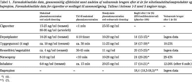 Størstedelen af Danmarks 1,5 million rygere er nikotinafhængige. Brug af nikotinsubstitution eller bupropion fordobler chancen for røgfrihed et år efter rygestop. Gravide rygere, som ikke kan holde op med at ryge uden medikamentel støtte, kan tilbydes nikotinsubstitution. Rygning er forbundet med en særlig stor risiko for patienter med arteriosklerotisk hjerte-kar-sygdom. Tilbageholdenhed med nikotinprodukter til disse patienter er ubegrundet. Bupropion eller nikotinsubstitution tåles godt af hjertepatienten.
