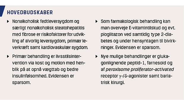 Non-alcoholic fatty liver disease and especially non-alcoholic steatohepatitis (NASH) and fibrosis are associated with severe liver disease and increased cardiovascular risk. It is therefore important to identify patients with NASH fibrosis. Therapeutical options include life style intervention and pharmacological treatment with vitamin E and pioglitazone; however, evidence of effect is scarce for all options. New treatments are under investigation and include glucagon-like peptide-1, farnesoid receptor as well as peroxisome proliferator-activated receptor-α/δ agonists. Bariatric surgery may be an option in selected patients.