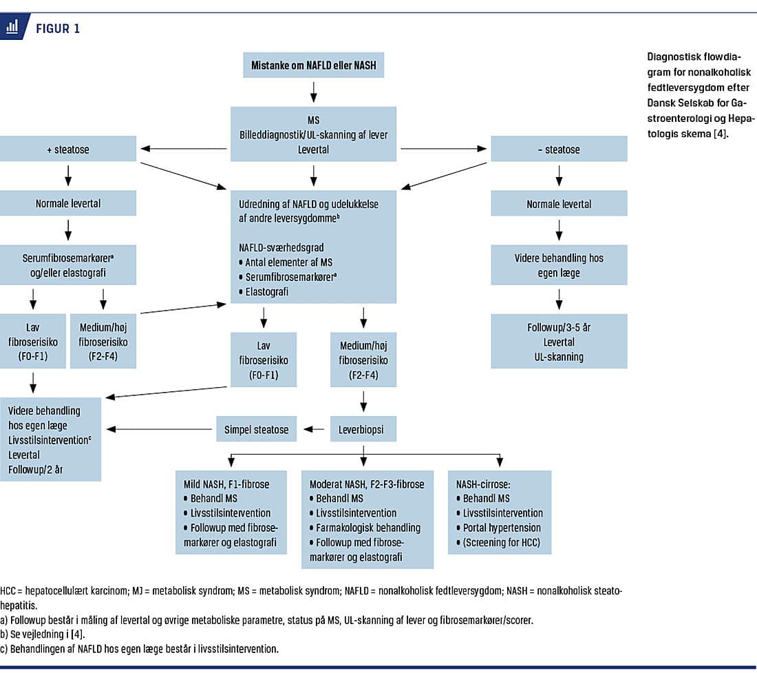 NAFLD inkl. NASH er i al væsentlighed asymptomatisk, hvorfor særligt alment praktiserende læger, internmedicinere, kirurger og pædiatere bør have mistanke om diagnosen hos relevante patientgrupper. Det anbefales at følge DSGH’s diagnostiske flowskema (Figur 1) og således screene patienter med MS og/eller diabetes for NAFLD. Risikoen for NASH øges, desto flere elementer af MS, der er til stede.