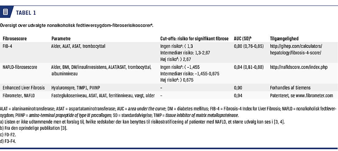 Man mangler desværre sensitive og specifikke noninvasive test til sikker identifikation af patienter med NASH og NASH-fibrose blandt de mange tilfælde af NAFLD. I stedet anbefales det, at man anvender sammensatte fibrosescorer, f.eks. FIB-4 eller NAFLD-fibrosescore (NFS), til risikostratificering. FIB-4 og NFS er baserede på almindeligt tilgængelige biokemiske markører og patientkarakteristika og kan beregnes på gratis apps. I Tabel 1 gennemgås de mest anvendte og bedst validerede scorer. Vi foreslår henvisning til speciallægevurdering, når en patient har billeddiagnostisk verificeret steatose og intermediær/høj risiko for fibrose vurderet ved f.eks. FIB-4 eller NFS og/eller forhøjede levertal.