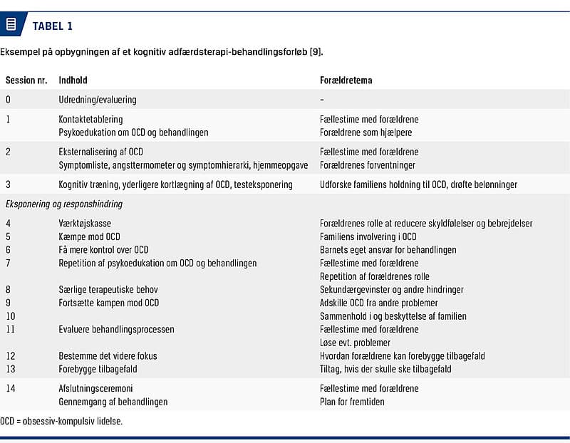 I de nationale kliniske retningslinjer anbefales kognitiv adfærdsterapi (KAT) som førstebehandling til børn og unge med mild, moderat og svær OCD [7]. KAT er en veldokumenteret behandlingsform til børn og unge med OCD [8] og bygger på teorier inden for adfærds- og kognitionspsykologien. KAT til OCD består typisk af 12-14 ugentlige sessioner med eksponering og responshindring som kernen i behandlingen. Et eksempel på opbygningen af et KAT-program kan ses i Tabel 1.
