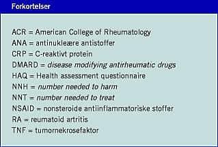 Et fælles inklusionskriterium for studierne var, at patienterne skulle opfylde klassifikationskriterierne for RA (American College of Rheumatology 1987-kriterier) og var ældre end 18 år. Patienterne skulle have aktiv RA udtrykt ved ømhed og hævelse af hhv. mindst ni og seks led i tre studier [2, 3, 7] og af hhv. mindst 12 og ti led samt forhøjet erytrocytsedimentationsrate og C-reaktivt protein (CRP) i to studier [5, 6]. I en undersøgelse stillede man tillige krav om forhøjet CRP, positiv IgM-reumafaktor og mindst en knogleerosion vurderet ud fra konventionel røntgenoptagelse [3]. I et studie anvendte man Disease Activity Score over 3,2 som adgangskriterium [4]. Behandlingssvigt af mindst et DMARD indgik blandt inklusionskriterierne i tre af undersøgelserne [5-7]. Behandling med methotrexat var obligat i tre af undersøgelserne [3, 4, 7], mens samtidig behandling med DMARD ikke var tilladt i to andre [5, 6]. I et studie var behandling med DMARD ikke et krav [2]. I ingen af studierne var det tilladt at ændre på doseringen af DMARD i de sidste fire uger før behandlingsstart.