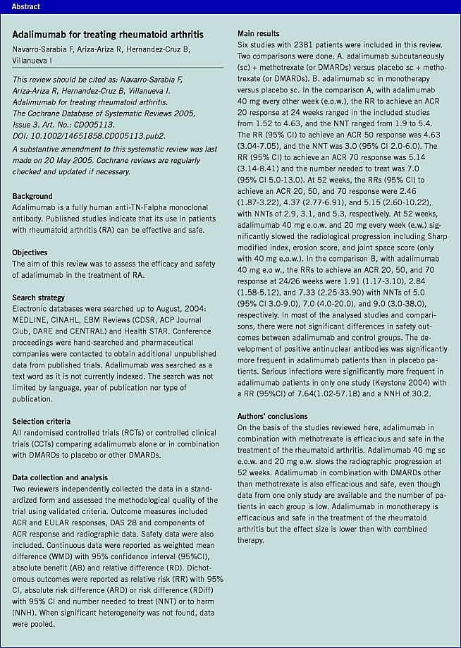 Formålet med Cochrane-analysen var at undersøge effekten ved behandling med adalimumab i kombination med methotrexat (eller andre DMARD) sammenlignet med methotrexat (eller andre DMARD) som monoterapi og effekten ved behandling med adalimumab i monoterapi sammenlignet med placebo ved RA. Desuden skulle sikkerheden ved brug af adalimumab med og uden samtidig DMARD vurderes. Analysen omfattede randomiserede, kontrollerede, kliniske undersøgelser og kontrollerede, kliniske undersøgelser.