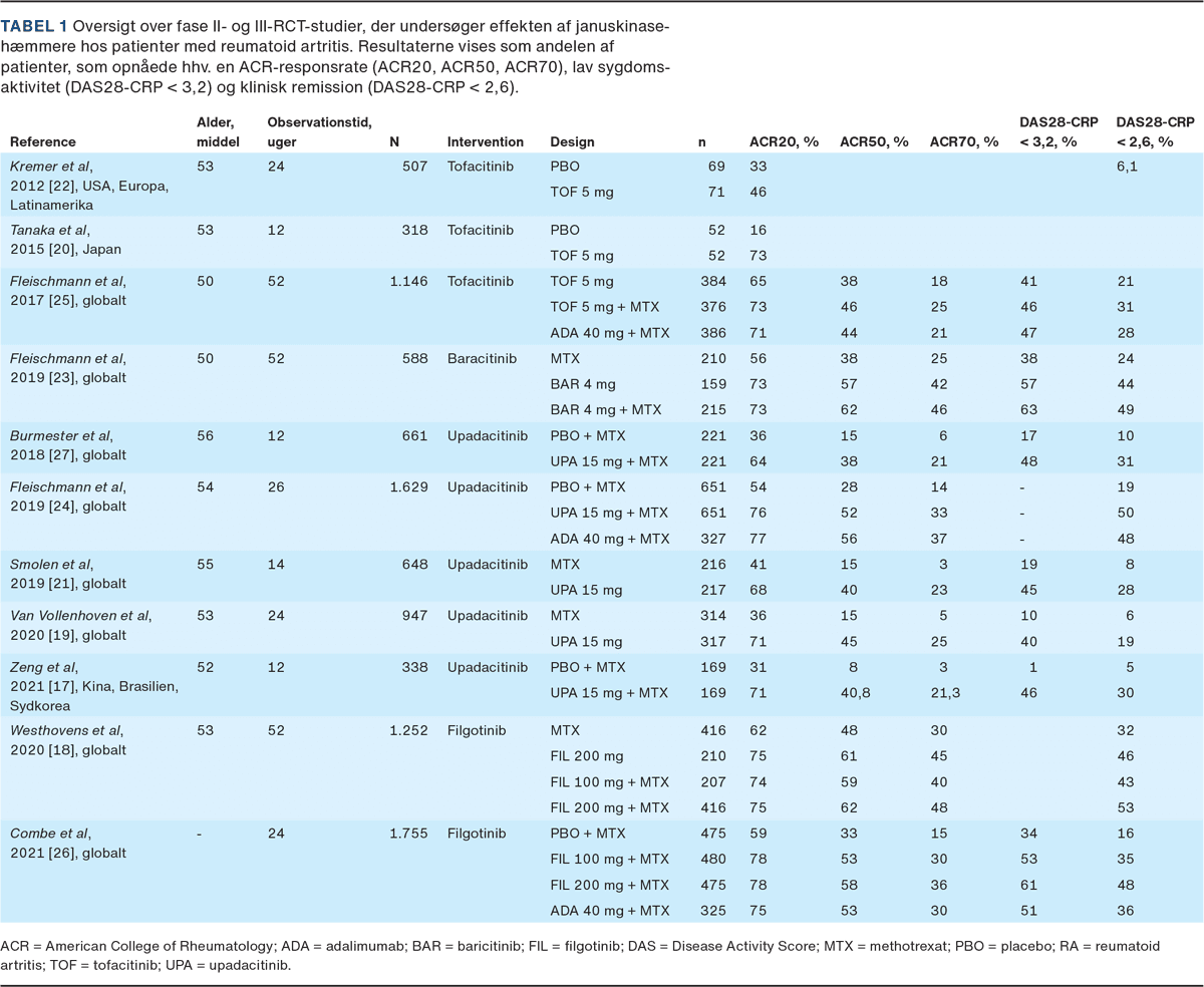 Effekten af JAK-hæmmere til behandling af RA er undersøgt i flere nyere studier. Ved en grundig litteratursøgning efter kvalitetsstudier, der beskriver korttidseffekten, fandtes i alt 11 randomiserede kontrollerede studier [17-27]. Studier for peficitinib er udeladt, da præparatet kun er registreret i Japan. En oversigt over studiernes demografi og resultater kan ses i Tabel 1. Studierne er alle sammenlignelige med hensyn til demografi, alder og køn. Ved søgning fandtes ikke studier, der har undersøgt skandinaviske patienter.