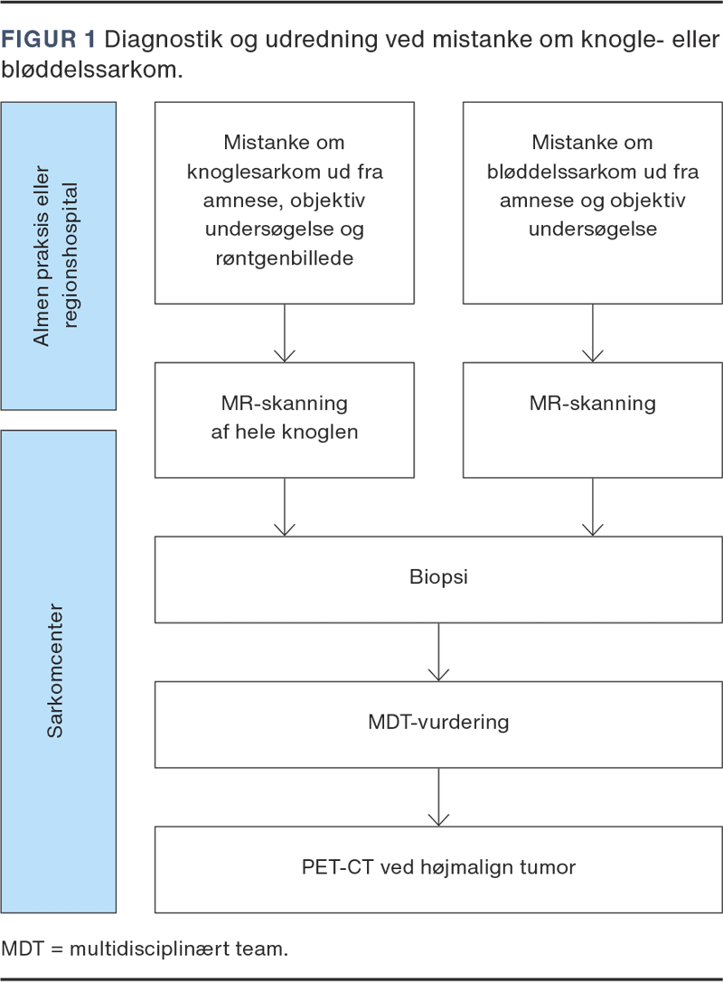 Ved mistanke om knoglesarkom udredes patienten primært med konventionel røntgen og MR-skanning af relevant anatomisk lokalisation [7]. Ved begrundet mistanke om sarkom på baggrund af den billeddiagnostiske udredning skal der henvises til et af de to sarkomcentre, Aarhus Universitetshospital eller Rigshospitalet. Her vurderes sygehistorien og relevant billeddiagnostik på multidisciplinært team (MDT)-konference med deltagelse af radiologer, onkologer, patologer og ortopædkirurger samt andre kirurgiske specialer ved behov (Figur 1). Hvis mistanken om knoglesarkom opretholdes, foretages UL-vejledt biopsi af tumorens bløddelskomponent eller åben biopsi fra den afficerede knogle [11].