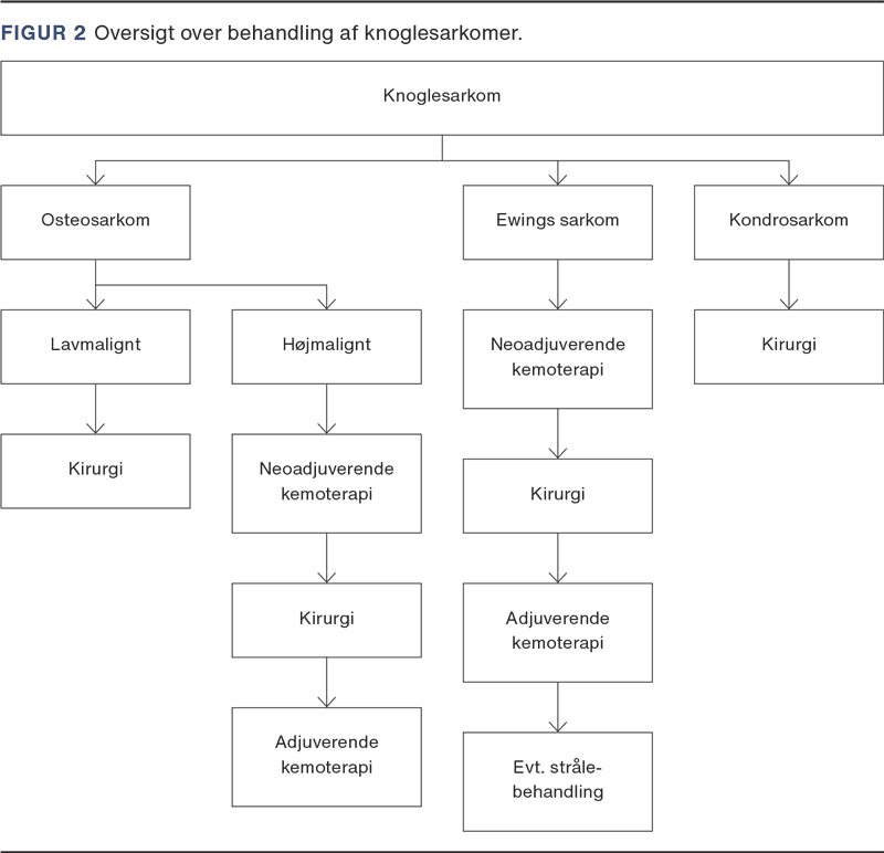 Sarkomer behandles forskelligt afhængigt af histologisk type, malignitetsgrad og anatomisk lokalisation (Figur 2 og Figur 3). Fælles for alle sarkomer er, at kirurgisk excision af tumor er en central del af den primære behandlingsstrategi. I takt med udvikling af rekonstruktionsmuligheder, implantater og hjælpeværktøjer tilstræbes samtidig opretholdelse af patientens postoperative funktionelle niveau. Højmaligne osteosarkomer og Ewings sarkomer behandles med præoperativ kemoterapi efterfulgt af kirurgisk tumorfjernelse og til slut postoperativ kemoterapi [12]. Ved Ewings sarkom kan der suppleres med strålebehandling [13, 14]. Kemoterapi og strålebehandling varetages af onkologisk afdeling. Lavmaligne osteosarkomer behandles udelukkende kirurgisk med tumorexcision [15]. Tumorexcision skal gøres efter principperne om vid margin [16, 17]. Dette involverer excision af hele tumor inklusive pseudokapsel samt en bræmme af sundt væv omkring. Ekstremitetsbevarende kirurgi tilstræbes i videst mulige omfang, dog uden at kompromittere den kirurgiske margin. Ved sådanne indgreb kræves rekonstruktion af den resecerede knogle og evt. involverede led. Det gøres enten ved biologisk eller ikkebiologisk rekonstruktion.