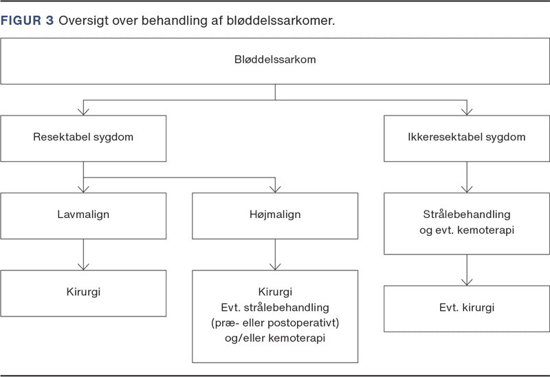 The diagnostic evaluation of sarcomas is carried out in one of the two sarcoma centres in Denmark – Aarhus University Hospital and Copenhagen University Hospital. Sarcomas are classified into soft tissue sarcomas and bone sarcomas. Furthermore, they are divided into low-grade and high-grade sarcomas according to the histopathology. This review confirms that the primary treatment for all sarcomas is surgical excision; however, chemotherapy and radiation therapy may be applied depending on the type of sarcoma. All sarcoma patients receive a minimum of five years of follow-up after treatment.