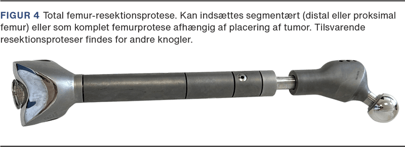 Ved ikkebiologisk rekonstruktion indsættes oftest resektionsproteser, som er modulære implantatsystemer, der kan tilpasses patientens anatomi under operationen og kan erstatte led og dele af en knogle, men også hele knogler (Figur 4). Ved diafysære sarkomer kan der være mulighed for ledbevarende kirurgi, og der kan i stedet indsættes en diafysær protese (bone bridge). Valget af biologisk eller ikkebiologisk rekonstruktion afhænger af flere faktorer, herunder patientens alder, tumortype og lokalisation.