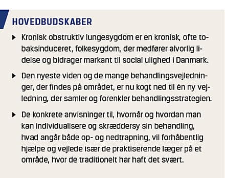 In 2012, The Danish Society of Respiratory Medicine gave birth to their most recent guideline regarding chronic obstructive pulmonary disease (COPD). Much has happened since, and in late 2017 an update has been published. Chapters have been deleted, and new ones added. The major alteration has been in the section concerning treatment with inhalation medication – now aiming at an easy stepwise up-titration of long-acting medicine as well as a guide of how to down-titrate inhaled corticosteroids. This article mainly focuses on how to treat stable COPD according to The Danish Society of Respiratory Medicine.